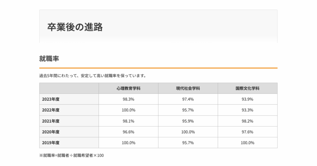 例えば以下は、名古屋市立大学大学院人間文化研究科・人文社会学部の卒業生のデータで、就職率は90%以上と高い水準となっていることが見て取れます。