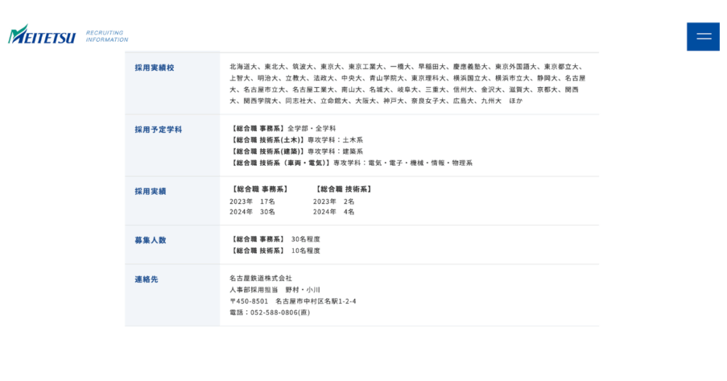 名古屋鉄道(名鉄)は地域インフラ企業として東海で人気が高く、公式の採用実績には名古屋大学・南山大学・愛知大学・中京大学・名城大学などの名が並びます。選考倍率は公表されていないため、最新の人数や選考情報は公式の採用ページで確認することをおすすめします。