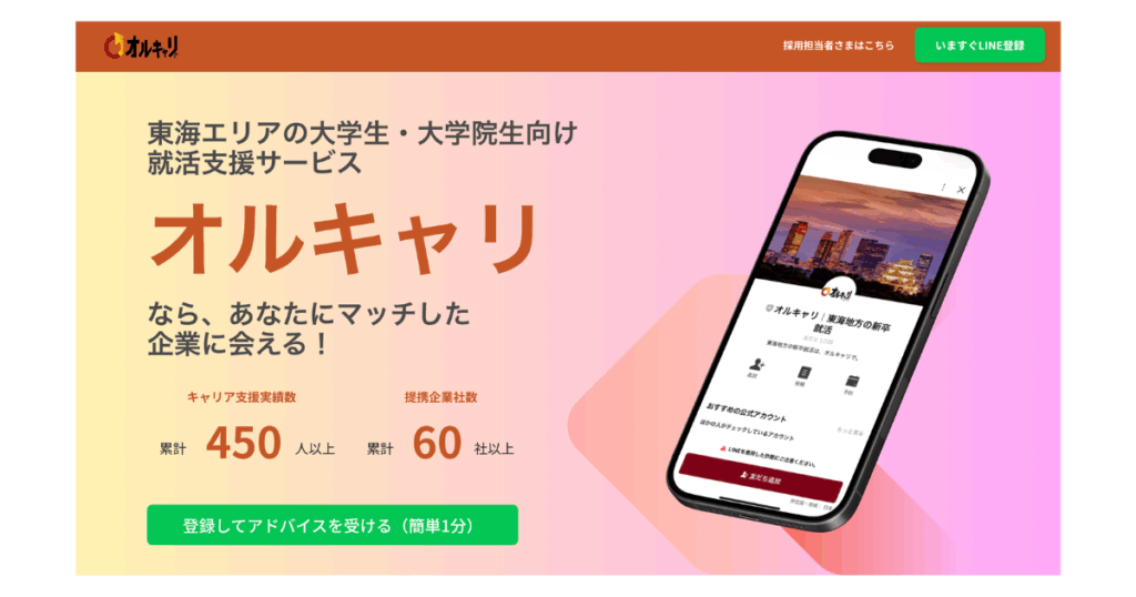 「オルキャリ」は、東海エリアの学生に特化し、キャリア面談や企業とのマッチングイベントを通じて就活を支援するサービスです。